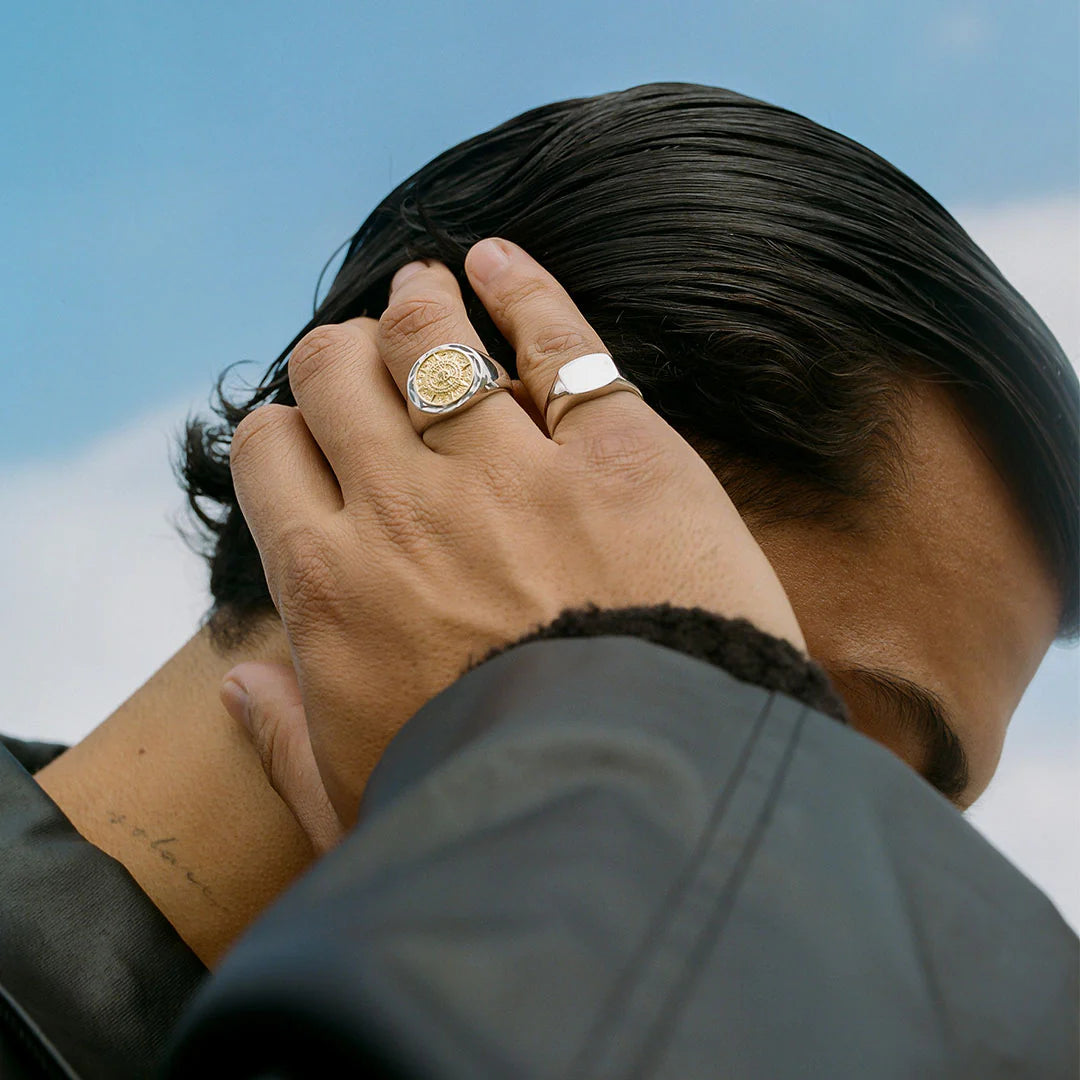 The Silver Compass Ring is a round signet ring with a two tone finish. It is made from 925 Sterling Silver & 14KT Gold and is hallmarked by the Goldsmiths' Company Assay Office verifying its quality.