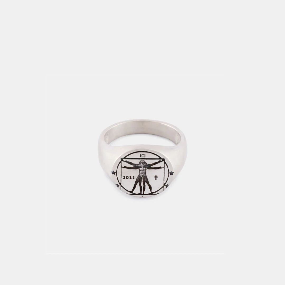The face of the ring features the drawing of the 'Vitruvian Man' by Leonardo Da Vinci. The artwork depicts a man in two positions with his arms and legs apart and inscribed in a circle and square, based on Leonardo's concept of ideal human body proportions. Above the outline of the man is the Crown, one of the Silver Denims 4 symbols. On one side is a Cross, another of our logos, and on the other side is '2011', our founding year. The ring has an oxidised finish to give it an aged, vintage look and to highlight the detailing on the face of the ring.